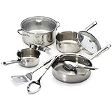 Combining high performance with a sleek design, this 10-piece cookware set includes a 1-quart covered saucepan, a 2-quart covered saucepan, a 5-quart covered Dutch oven, and a 9-1/2-inch open deep saute pan, as well as three handy tools--a spoon, a slotted spoon, and a slotted turner. Use the saucepans for breakfast oatmeal or homemade marinara sauce and the Dutch oven for soups and stews or for boiling pasta. The deep saute pan works well for chicken and rice and other one-dish meals--start by browning meats or sauteing onions, then add liquid and other ingredients to finish on the stovetop or in the oven. Each tool and long-handled pan comes with a hole at the end for convenient hanging storage when not in use.