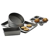 This set consists of 5 of Calphalon's most popular and useful Classic Bakeware shapes: the 12"x17" jelly roll pan, a six cup muffin pan, a 8"x5" large loaf pan, and (2) 8" Round cake Pans!You will love the versatility, durability and easy clean up that you will get from this bakeware.The nonstick coating is specially formulated to release even the stickiest foods with ease.The commercial shapes and sizes will give you professional results!